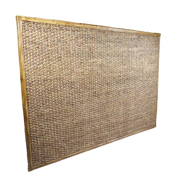 Cabecero de cama realizado con jacinto de agua seco y marco de bambú y ratán