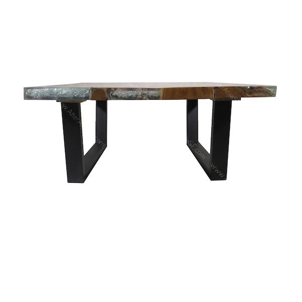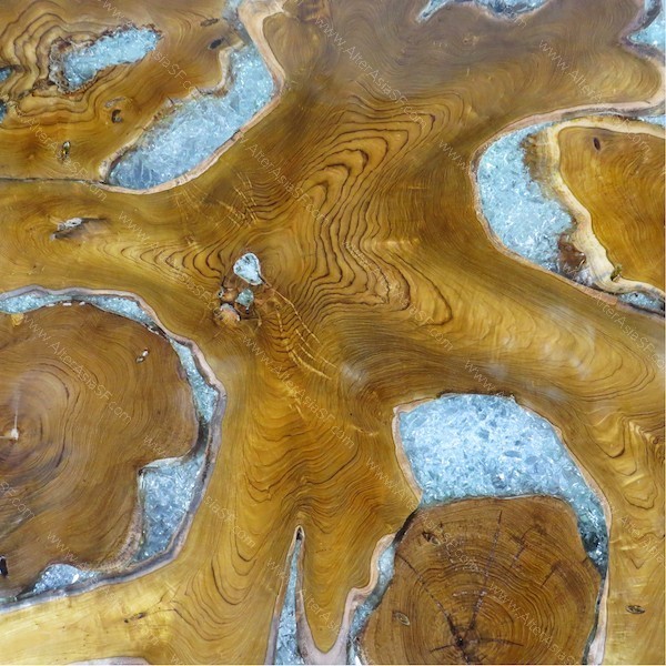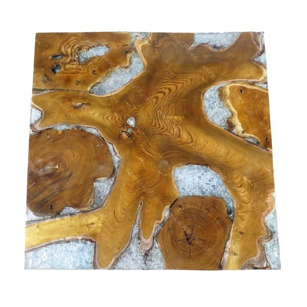 Mesa baja de madera de teca y resina acrílica con cristales en su interior